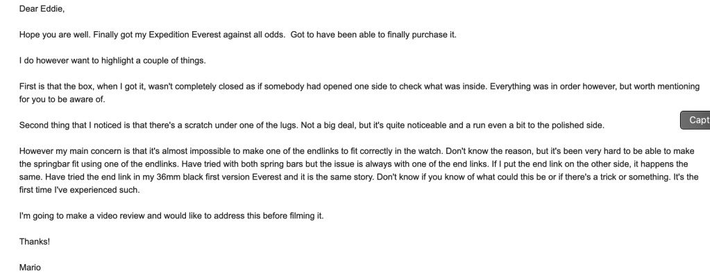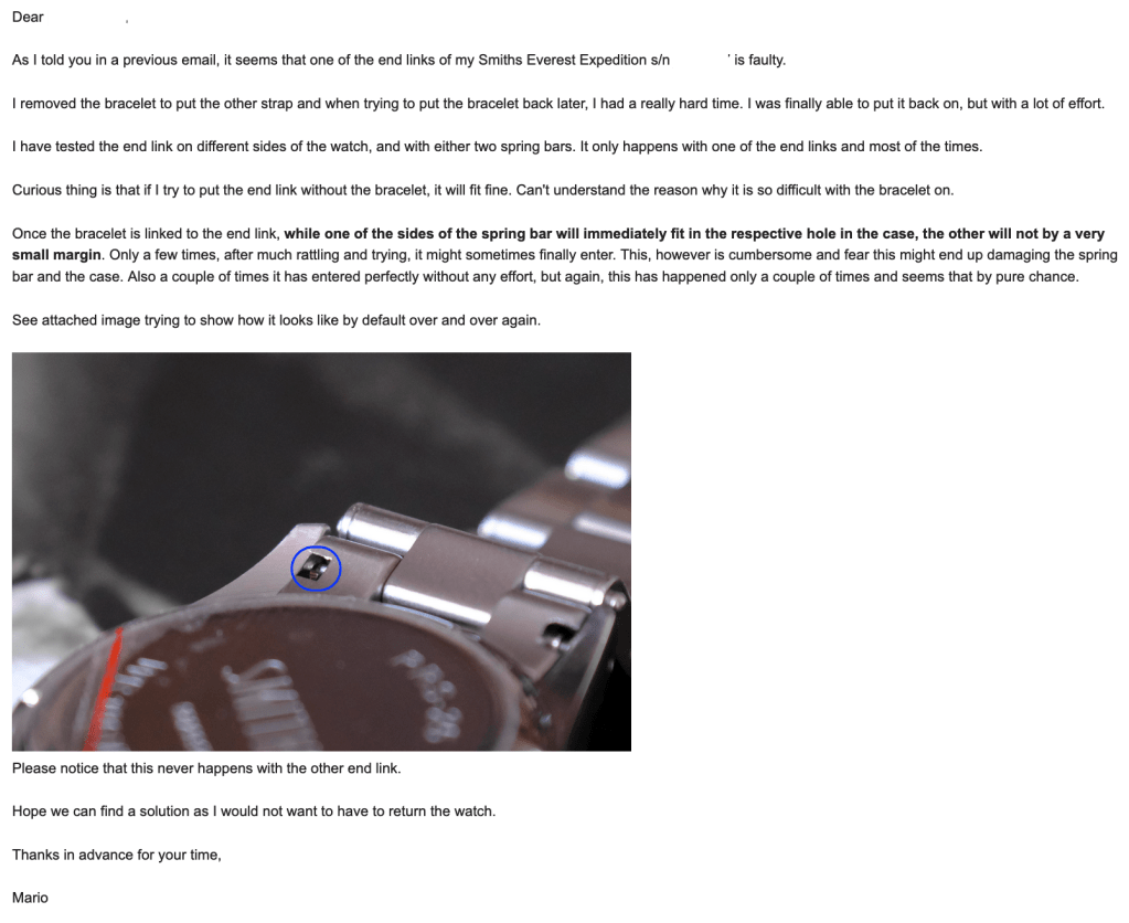 I wanted to know if he could give some advice or know of any solution. He replied with a very brief sentence just saying that what I said was not possible as the watch was delivered with the bracelet on, thus the end link had to be alright.