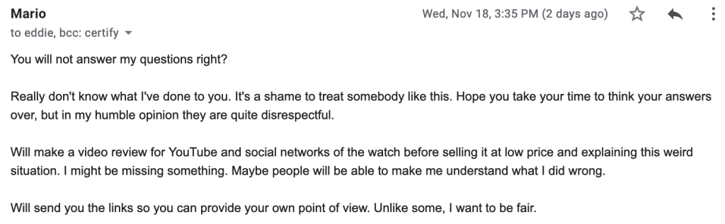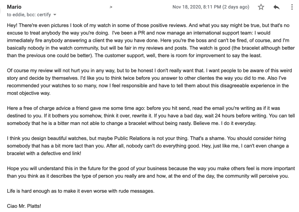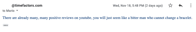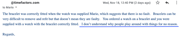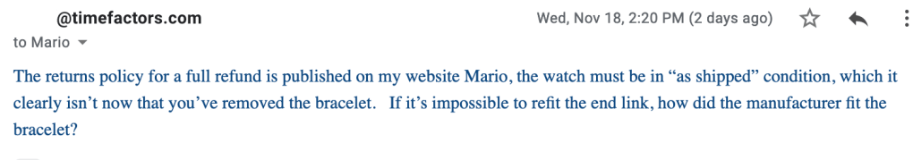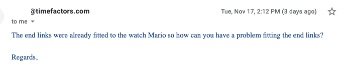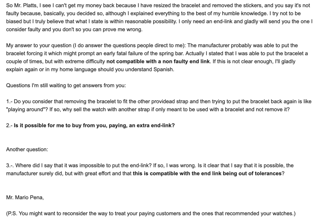 Because even if he was right, which I truly believe was not, the way he writes in such a disrespectful manner, the lack of care to a client, the absence of empathy, makes me not want to recommend buying from his store at all. There are many other places where you can put your money, sellers that will respect you the way you deserve and not be treated like a poor bitter man unable to put a defective end link in a watch.